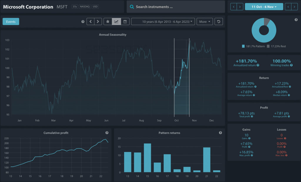 - Buying Microsoft in the Autumn? Check Seasonax! MSFT rose 100% of the time over the past ten years in October with a 181.70% annualized return.